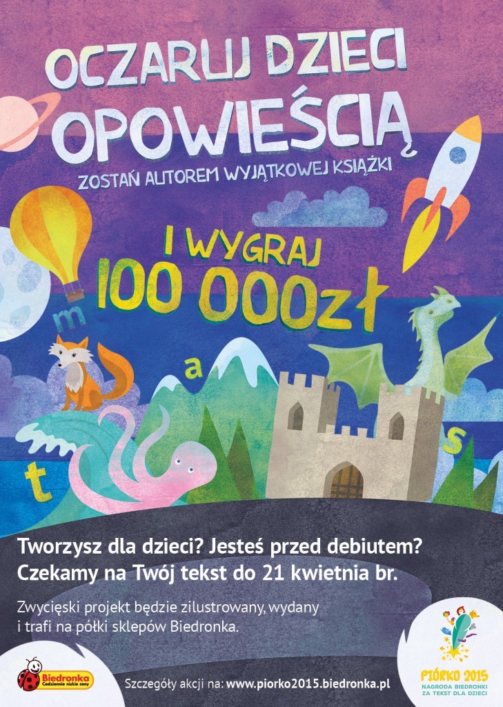 5 marca rusza wyjątkowy konkurs „Piórko 2015″ organizowany przez sieć Biedronka. Ma on na celu wyłonienie najlepszego tekstu dla dzieci spośród prac nadsyłanych przez autorów, którzy do tej pory jeszcze nie publikowali*. Nagroda dla zwycięzcy to 100 tysięcy złotych. Dodatkowo nagrodzony tekst stanie się kanwą dla drugiego etapu konkursu skierowanego do ilustratorów, a następnie zostanie wydany w formie książki w nakładzie kilkudziesięciu tysięcy egzemplarzy, która będzie do nabycia w ponad 2600 sklepach Biedronki w całej Polsce. Konkurs Biedronki został objęty honorowym patronatem Rzecznika Praw Dziecka.