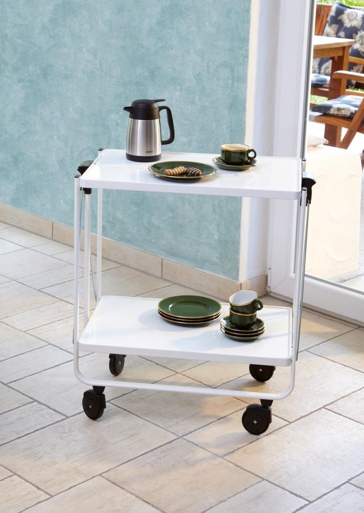 Składany biały wózek o wysokości 72,5 cm z dwoma półkami o wymiarach 60 x 40 cm jest zaprojektowany pod kątem oszczędności miejsca i wygody. Każda z jego półek ma aż 15 kg udźwigu.