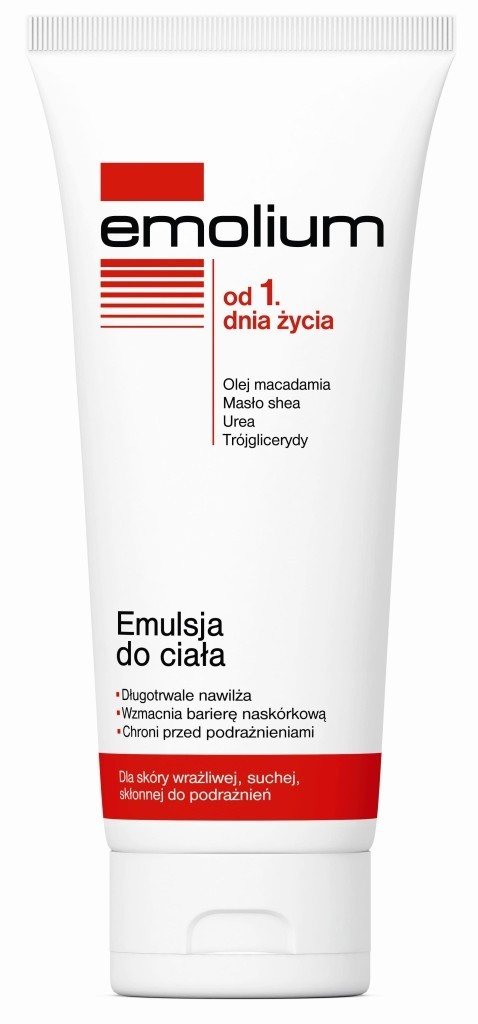 Emulsja do ciała Emolium to nowoczesny emolient przeznaczony do pielęgnacji skóry wrażliwej, suchej i skłonnej do podrażnień. Preparat długotrwale nawilża skórę, zapewniając jej zdrowe funkcjonowanie. Zmiękcza oraz uelastycznia naskórek, wzmacnia barierę naskórkową, ogranicza utratę wody, chroni przed podrażnieniami, wysuszeniem i czynnikami zewnętrznymi.