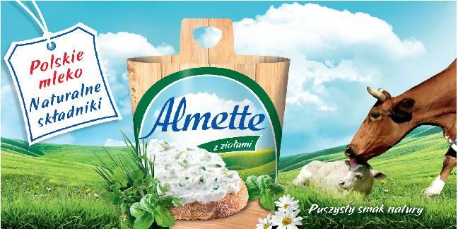 Almette lubi pozytywnie zaskakiwać! Dlatego przyszedł czas na nowe komunikaty: polskie mleko i naturalne składniki, a w ślad za nimi zmieniamy szatę graficzną opakowania, która jeszcze bardziej podkreśla naturalny i lekki charakter produktu. Charakterystyczny skopek przyciąga uwagę autentycznym drewnem, nowe ilustracje dodatków wiernie oddają ich prawdziwy wygląd, a zielona łąka przywodzi na myśl najczystszą naturę.