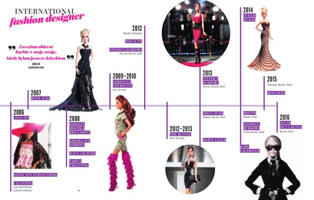 Barbie to postać, która wcielając się w role najsłynniejszych gwiazd Hollywood – Grace Kelly, czy Audrey Hepburn, potrafiła również fantastycznie odnaleźć się w codziennej domowej rzeczywistości, gdzie zajmowała się domem i spędzała szczęśliwy czas z rodziną. Jest to także muza wielkich artystów – przedstawiana na obrazach Andiego Warhola i ubierana przez najsławniejszych projektantów świata, takich jak np. Oscar de la Renta. Moda, choć nie jest ona jedyną pasją Barbie, odgrywa kluczową rolę w jej życiu. Szykowny wizerunek, którym charakteryzuje się od ponad pięciu dekad to potwierdzenie jej niezwykłej umiejętności podążania za trendami i dopasowywania ich do swojego stylu bycia. Barbie również sama wyznacza nowe kierunki w modzie, a jej postać nieustannie inspiruje kreatorów do tworzenia wyjątkowych strojów. Niepowtarzalne kolekcje, dedykowane specjalnie dla niej, stworzone zostały przez najsłynniejsze nazwiska świata mody – m.in.: Diora, Givenchy, Versace, Armaniego, Burberry, Karla Lagerfelda czy Moschino.