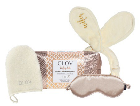 GLOV Wifey Set zawiera rękawiczkę GLOV On-The-Go, satynową maskę do spania oraz opaskę do włosów Bunny Ears.