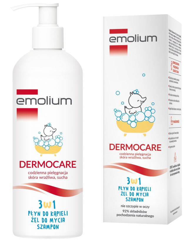 Emolium Dermocare® 3w1 to połączenie wysokiej jakości składników aktywnych (92% pochodzenia naturalnego), które zapewniają wyraźne nawilżenie i chronią przed wysuszeniem. Preparat myje i oczyszcza całe ciało i włosy, niwelując podrażnienia i zaczerwienienia, nie zaburza naturalnego pH skóry, pozostawia na niej delikatny film ochronny. Dodany do kąpieli delikatnie się pieni i dobrze spłukuje, ma delikatny, przyjemny zapach. Zastosowany jako szampon do włosów sprawia, że włosy są puszyste, błyszczące i łatwo się rozczesują. Nie podrażnia oczu, nie szczypie ani nie powoduje łzawienia. Produkt został opracowany we współpracy z dermatologami i przebadany dermatologicznie, ma wysoki stopień tolerancji dla skóry. Może być stosowany od 1. miesiąca życia.