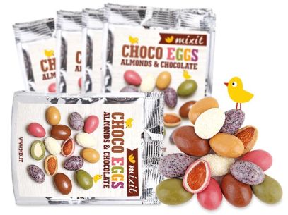 Świetnym rozwiązaniem są Wiel-koko-nocne jajka do kieszeni od firmy Mixit. Jest to sezonowa kolekcja limitowana, w której znajdziemy najsmaczniejsze jajeczka z chrupiącym migdałem w środku. Są one otoczone pyszną, białą czekoladą, a także liofilizowanymi owocami, takimi jak jagody lub kokos. Znajdziemy też ciekawe smaki takie jak herbata matcha, różowa czekolada czy słony karmel. Słodycze te nie posiadają sztucznych barwników oraz szkodliwego oleju palmowego.
