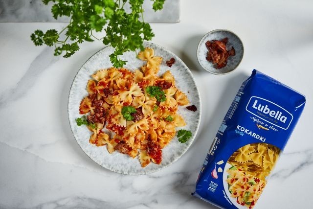 Kokardki Lubella w sosie pomidorowym z chilli (opcjonalnie) i boczkiem