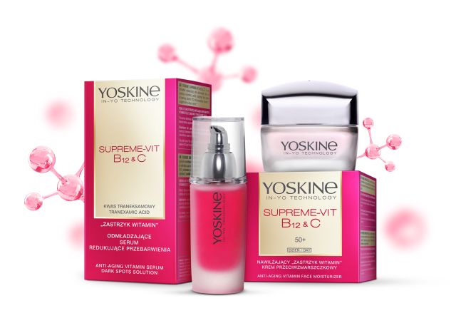 Witamina B12 to bohaterka najnowszej linii marki Yoskine. Ma fenomenalne właściwości regenerujące skórę, przyspiesza odnowę komórek i spowalnia proces fotostarzenia. Ponadto, łagodzi podrażnienia i zaczerwienienia. Dzięki niej skóra odzyskuje młodzieńczą świeżość, wygląda na zrelaksowaną i starzeje się wolniej. Działanie witaminy B12 wspomaga innowacyjna forma witaminy C połączona z wektorem krzemowym, który zapewnia szybsze i skuteczniejsze przenikanie do najgłębszych warstw skóry. YOSKINE SUPREME-VIT B12 & C działa niczym „witaminowy zastrzyk” o szerokim działaniu odmładzającym: redukuje zmarszczki, poprawia koloryt, rozjaśnia przebarwienia, a także wzmacnia napięcie skóry. Linia przyciąga wzrok różowym kolorem produktów – jest on w 100% naturalny i wynika z charakterystycznej barwy witaminy B12.