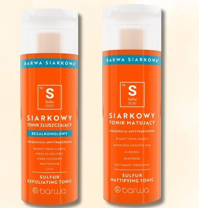 Tonik jest nie tylko uzupełnieniem pielęgnacji. Pomaga nam przywrócić prawidłowe pH skóry, co w przypadku cery trądzikowej jest bardzo istotne. Na ten etap pielęgnacji Barwa Siarkowa® również przygotowała dwa różne produkty. Siarkowy Tonik Złuszczający rozjaśnia i wygładza skórę, dodaje jej zdrowego blasku, ogranicza powstawanie niedoskonałości i niweluje te już istniejące. Dzięki zawartości kwasów glikolowego i mlekowego pozostawia skórę rozświetloną, gładką, świeżą i czystą bez uczucia ściągnięcia. Sprawdzi się do codziennego stosowania przy skórze tłustej bez niedoskonałości, jako profilaktyka przeciwtrądzikowa oraz przy nielicznych, świeżych i delikatnych niedoskonałościach Natomiast przy bardzo opornym trądziku i nadmiernym wydzielaniu sebum najlepiej jest postawić na Siarkowy Tonik Matujący. Odświeża, wygładza skórę oraz ogranicza powstawanie niedoskonałości. Formuła została wzbogacona o łagodzący panthenol, delikatnie złuszczające kwasy AHA oraz ekstrakty owocowe zmniejszające przetłuszczanie się skóry. Obu toników możesz używać bez użycia wacików – zwłaszcza przy zaognionych stanach zapalnych staraj się nie podrażniać skóry i unikać jej pocierania.