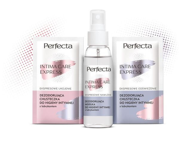 Higiena okolic intymnych to troska o swoje dobre samopoczucie i zdrowie. A odpowiednia pielęgnacja to jednocześnie najlepsza profilaktyka zapobiegająca infekcjom tej wrażliwej okolicy. Nowe produkty PERFECTA INTIMA CARE EXPRESS pomogą nam zadbać o nie w zarówno w domu, jak i w podróży, czy po treningu, a także w podczas długiego i wyczerpującego dnia w pracy. Mgiełka ekspresowo odświeża, łagodzi podrażnienia i zmniejsza ryzyko infekcji, natomiast chusteczki – w zależności od wariantu – skupiają się na ekspresowych efektach: ukojeniu lub odświeżeniu. Wszystkie produkty z linii zawierają lubrykant dbający o optymalne nawilżenie i komfort.