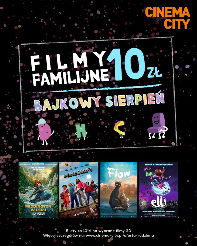 Wakacje trwają w najlepsze. To idealny moment na to, by – razem z dziećmi – nadrobić filmowe zaległości lub po raz drugi obejrzeć ulubione produkcje. A tak się składa, że sierpień w Cinema City będzie iście bajkowy. Na wielki ekran wrócą takie familijne hity, jak „Paddington w Peru”, „Minecraft: Film”, „Flow” czy „Elli i ekipa straszaków”. Bilety na pełne wrażeń seanse będzie można kupić za 10 złotych.