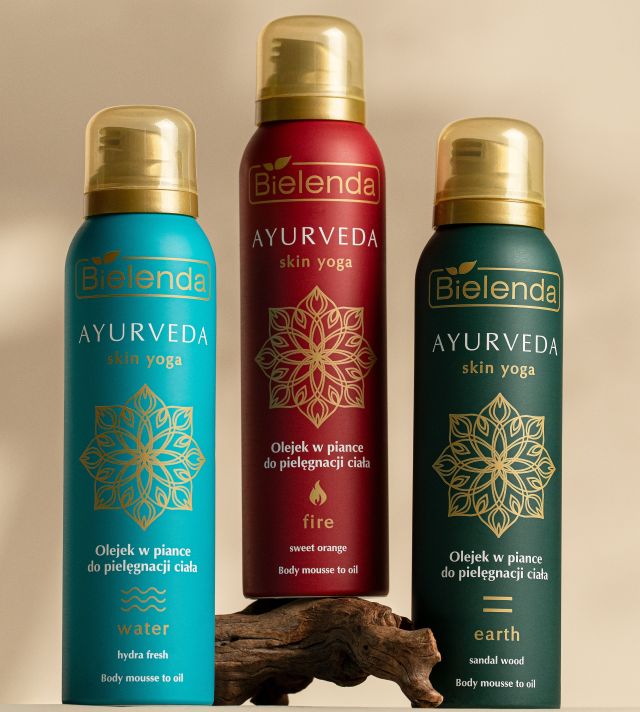 Bielenda Ayurveda Skin Yoga to trzy olejki do pielęgnacji ciała w postaci delikatnej pianki, jak żywioły – ogień, ziemia i woda – tworzą harmonijną całość. Nasycone aromatycznymi olejkami, otulają ciało zmysłowymi zapachami sweet orange, sandal wood i hydra fresh. Perfumowane masy utrzymują się na skórze przez wiele godzin, a ich innowacyjna formuła, zamknięta w aluminiowych puszkach, zmienia się z jedwabistego olejku w aksamitny mus.