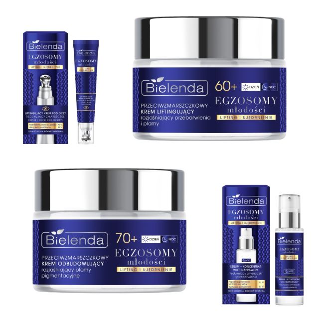 Produkty z linii Bielenda Egzosomy Młodości ujędrniają i liftingują skórę, redukują zmarszczki oraz przebarwienia, cera nabiera nowej jakości, staje się bardziej jednolita i promienna, odzyskuje blask i młodszy wygląd. Skuteczne formuły produktów działają dwukierunkowo – molekularne egzosomy działają w głębszych warstwach skóry, natomiast autorski liposomalny kompleks depigmentacyjny Melano Perfect zmniejsza widoczność zmarszczek i przebarwień w celu uzyskania młodziej wyglądającej, jednolitej cery.Kremowe, aksamitne, odpowiednie dla delikatnej skóry dojrzałej (również wrażliwej) formuły zamknięto w siedmiu produktach. Trzy kremy przeciwzmarszczkowe z dedykacją dla kobiet 50+, 60+ i 70+, serum rozświetlające na dzień z SPF50, serum-koncentrat na noc, krem pod oczy z massagerzem oraz maseczka to szeroka gam synergicznie działających kosmetyków.